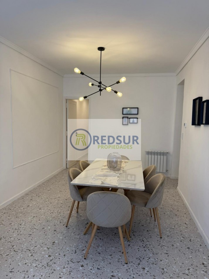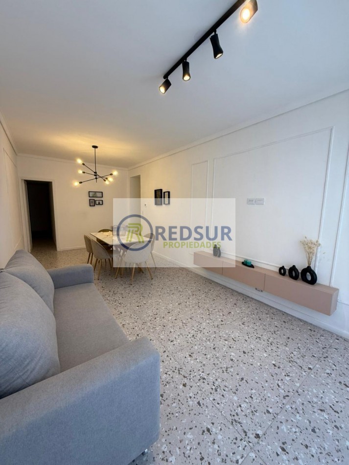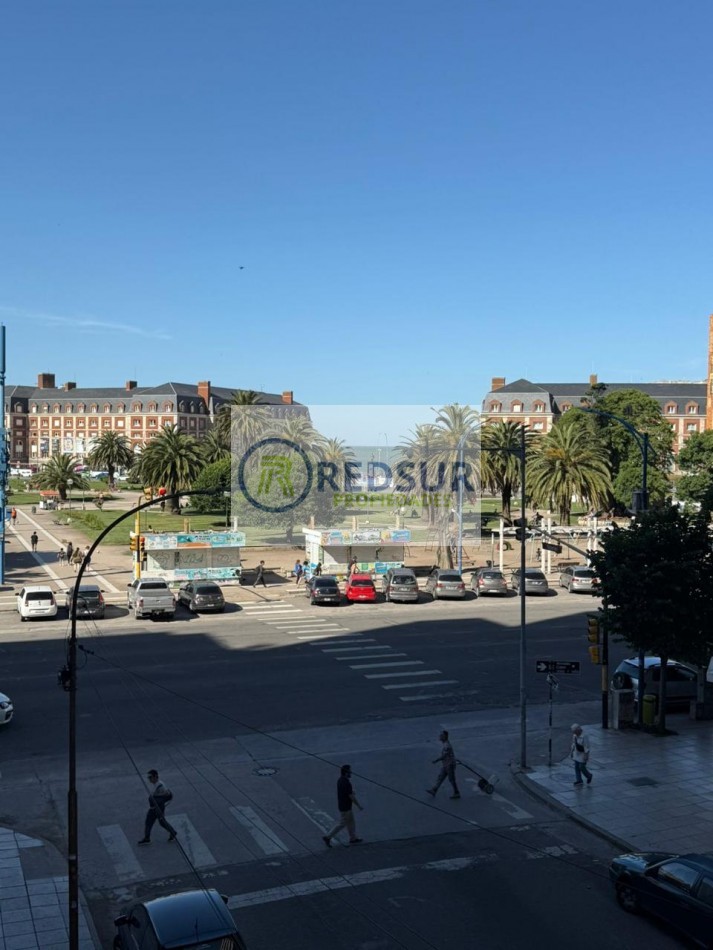 Amplio living comedor con balcón saliente a la calle y vista lateral a la plaza y al mar