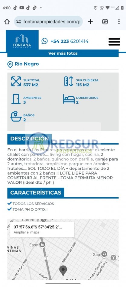 En el barrio Los Pinares presentamos este excelente chalet con parque.... living con hogar, cocina, 2 dormitorios, 2 baños, quincho con parrilla, garaje para 2 autos, trotadora, amplísimo parque con árboles frutales.... SOL TODO EL DÍA + departamento de 2 ambientes con 2 baños !! LOTE LIBRE PARA CONSTRUIR AL FRENTE --TOMA PERMUTA MENOR VALOR
