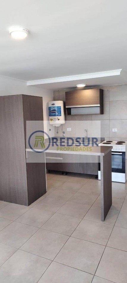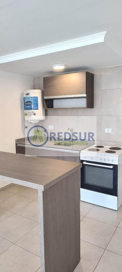 Cocina integrada con termotanque eléctrico, cocina eléctrica y heladera con Freezer.